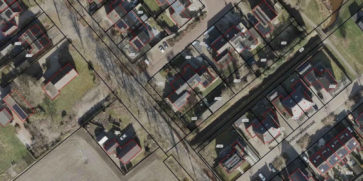 Het perceel waarop Poolster 1 staat heeft een oppervlakte van 439 m². Dit is een groot perceel. De perceeloppervlakte wordt geregistreerd door het Kadaster. Gedetailleerde informatie over de maten van dit perceel kunt u vinden in het rapport Kadastrale kaart met maatvoering van Poolster 1.