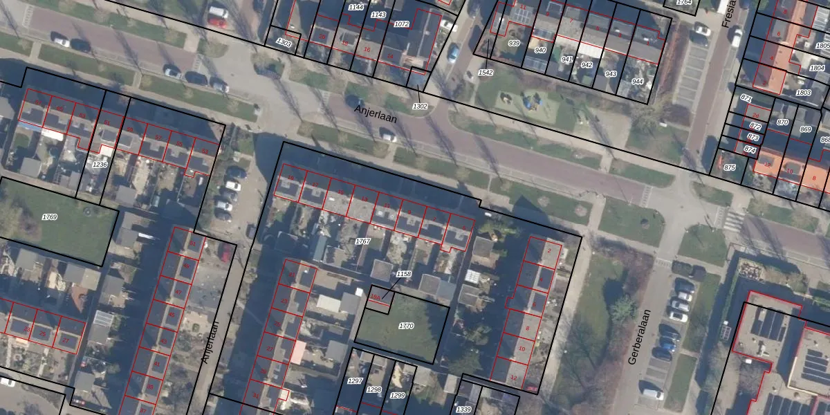 Het perceel waarop Anjerlaan 9 staat heeft een oppervlakte van 3852 m². Dit is een zeer groot perceel. De perceeloppervlakte wordt geregistreerd door het Kadaster. Gedetailleerde informatie over de maten van dit perceel kunt u vinden in het rapport Kadastrale kaart met maatvoering van Anjerlaan 9.