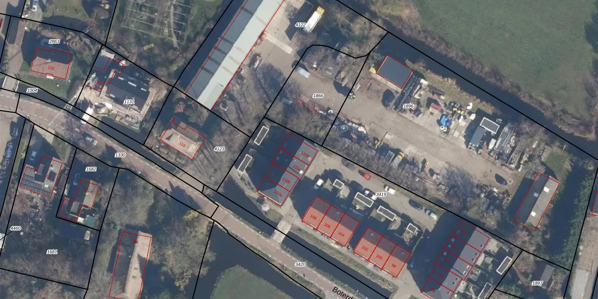 Het perceel waarop Boterdijk 110-d staat heeft een oppervlakte van 3249 m². Dit is een zeer groot perceel. De perceeloppervlakte wordt geregistreerd door het Kadaster. Gedetailleerde informatie over de maten van dit perceel kunt u vinden in het rapport Kadastrale kaart met maatvoering van Boterdijk 110-d.