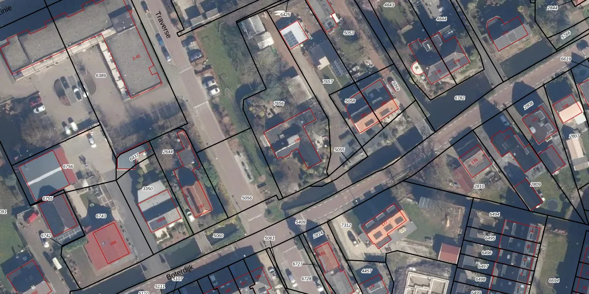 Het perceel waarop Boterdijk 186 staat heeft een oppervlakte van 1115 m². Dit is een zeer groot perceel. De perceeloppervlakte wordt geregistreerd door het Kadaster. Gedetailleerde informatie over de maten van dit perceel kunt u vinden in het rapport Kadastrale kaart met maatvoering van Boterdijk 186.