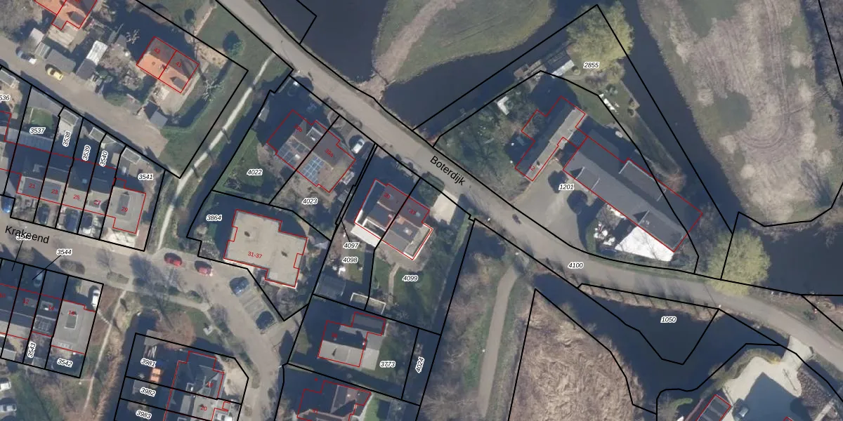 Het perceel waarop Boterdijk 37 staat heeft een oppervlakte van 595 m². Dit is een groot perceel. De perceeloppervlakte wordt geregistreerd door het Kadaster. Gedetailleerde informatie over de maten van dit perceel kunt u vinden in het rapport Kadastrale kaart met maatvoering van Boterdijk 37.