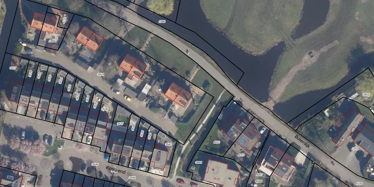 Het perceel waarop Boterdijk 41 staat heeft een oppervlakte van 3135 m². Dit is een zeer groot perceel. De perceeloppervlakte wordt geregistreerd door het Kadaster. Gedetailleerde informatie over de maten van dit perceel kunt u vinden in het rapport Kadastrale kaart met maatvoering van Boterdijk 41.