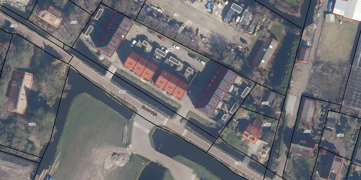 Het perceel waarop Boterdijk 98 staat heeft een oppervlakte van 3249 m². Dit is een zeer groot perceel. De perceeloppervlakte wordt geregistreerd door het Kadaster. Gedetailleerde informatie over de maten van dit perceel kunt u vinden in het rapport Kadastrale kaart met maatvoering van Boterdijk 98.