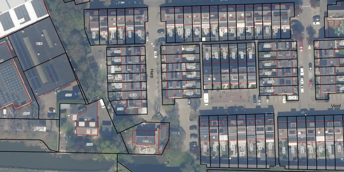 Het perceel waarop Harp 9 staat heeft een oppervlakte van 115 m². Dit is een middelgroot perceel. De perceeloppervlakte wordt geregistreerd door het Kadaster. Gedetailleerde informatie over de maten van dit perceel kunt u vinden in het rapport Kadastrale kaart met maatvoering van Harp 9.