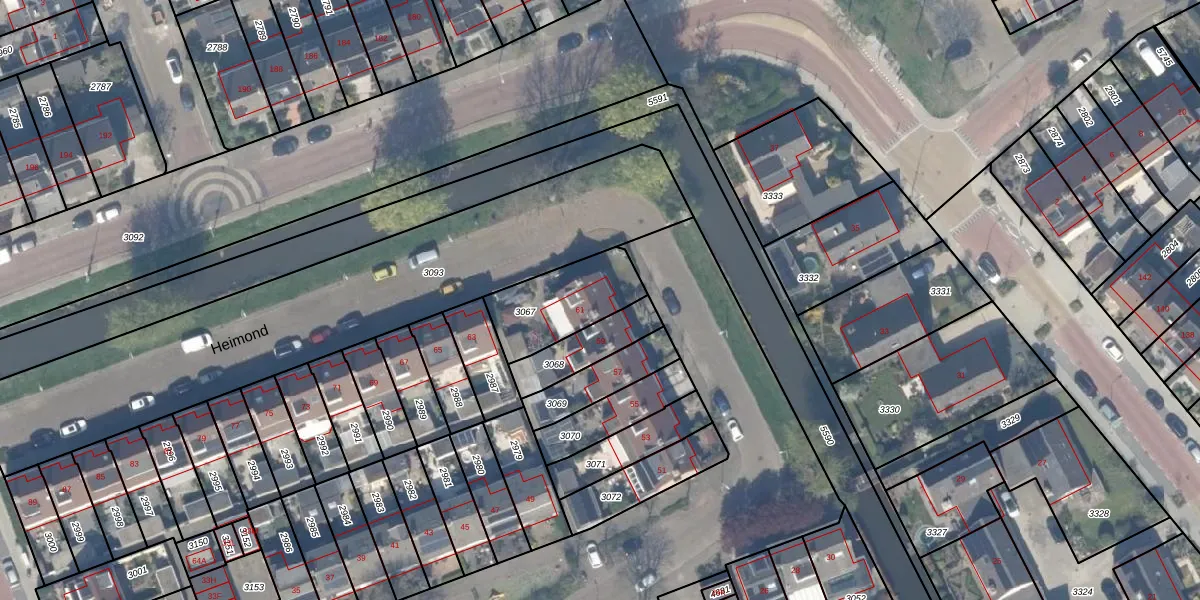 Het perceel waarop Heimond 61 staat heeft een oppervlakte van 275 m². Dit is een middelgroot perceel. De perceeloppervlakte wordt geregistreerd door het Kadaster. Gedetailleerde informatie over de maten van dit perceel kunt u vinden in het rapport Kadastrale kaart met maatvoering van Heimond 61.