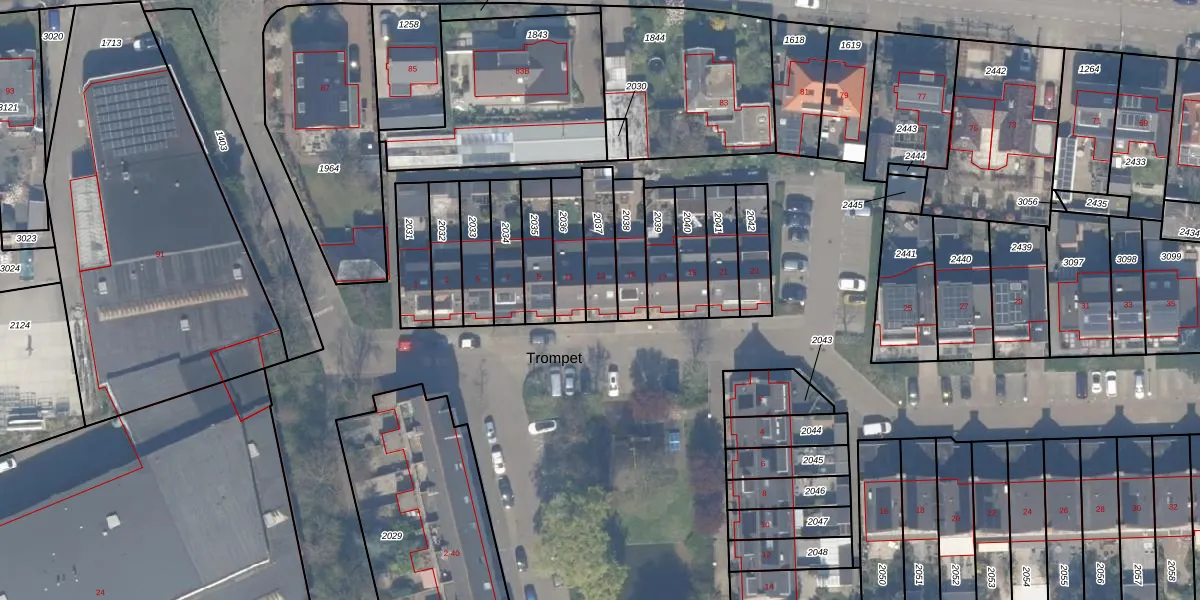 Het perceel waarop Trompet 13 staat heeft een oppervlakte van 133 m². Dit is een middelgroot perceel. De perceeloppervlakte wordt geregistreerd door het Kadaster. Gedetailleerde informatie over de maten van dit perceel kunt u vinden in het rapport Kadastrale kaart met maatvoering van Trompet 13.