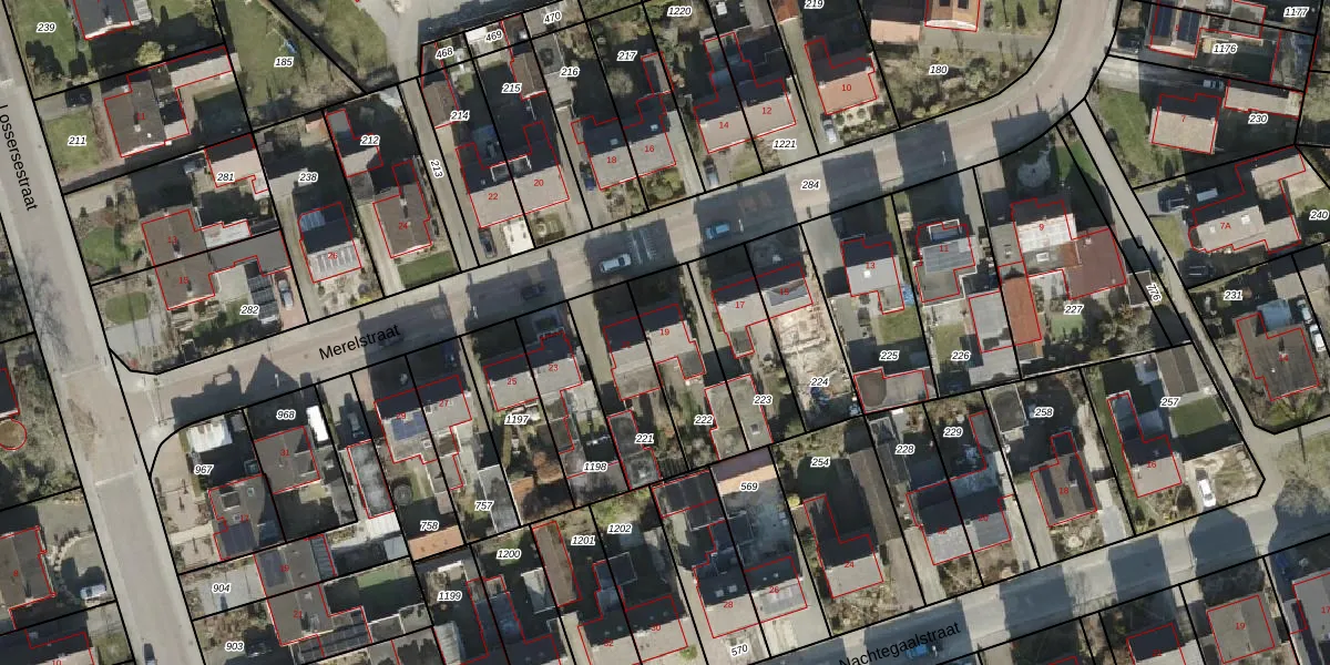 Merelstraat 19 is gelegen op kadastraal perceel LSR00O222. Deze kadastrale aanduiding is uniek en wordt gebruikt door het Kadaster om eigendomsrechten en andere zakelijke rechten vast te leggen. Het perceel maakt onderdeel uit van de kadastrale gemeente Losser.
