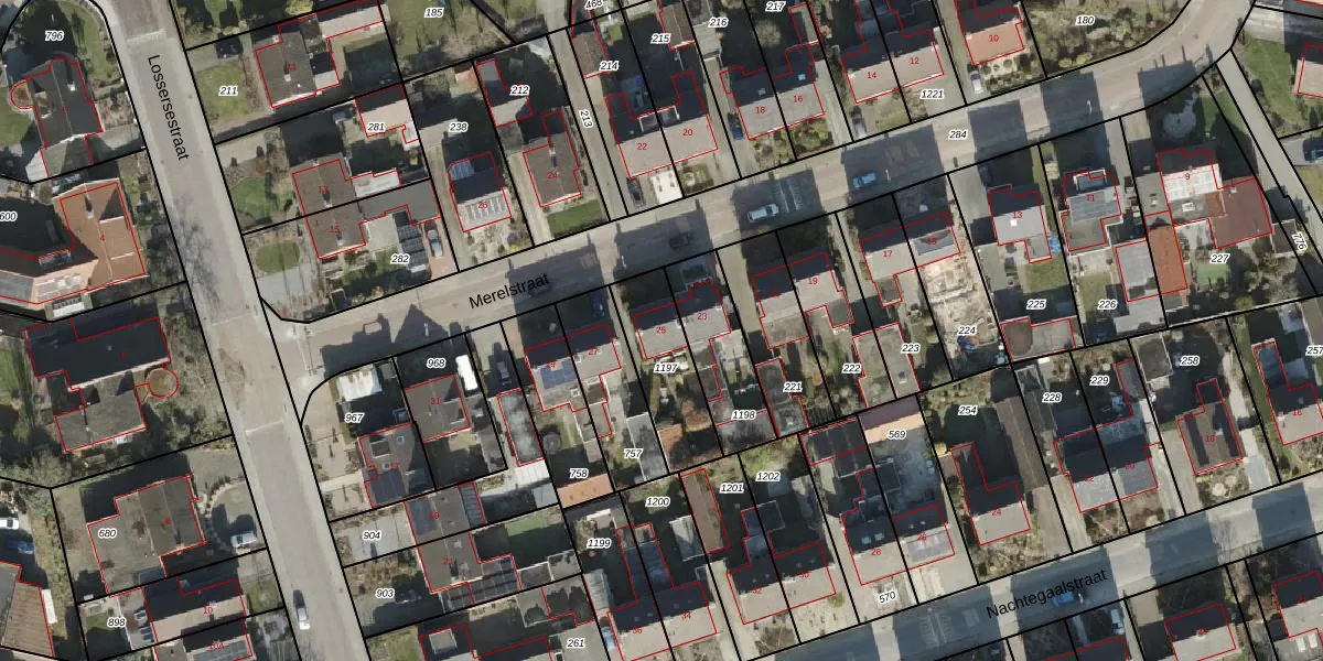Merelstraat 25 is gelegen op kadastraal perceel LSR00O1197. Deze kadastrale aanduiding is uniek en wordt gebruikt door het Kadaster om eigendomsrechten en andere zakelijke rechten vast te leggen. Het perceel maakt onderdeel uit van de kadastrale gemeente Losser.