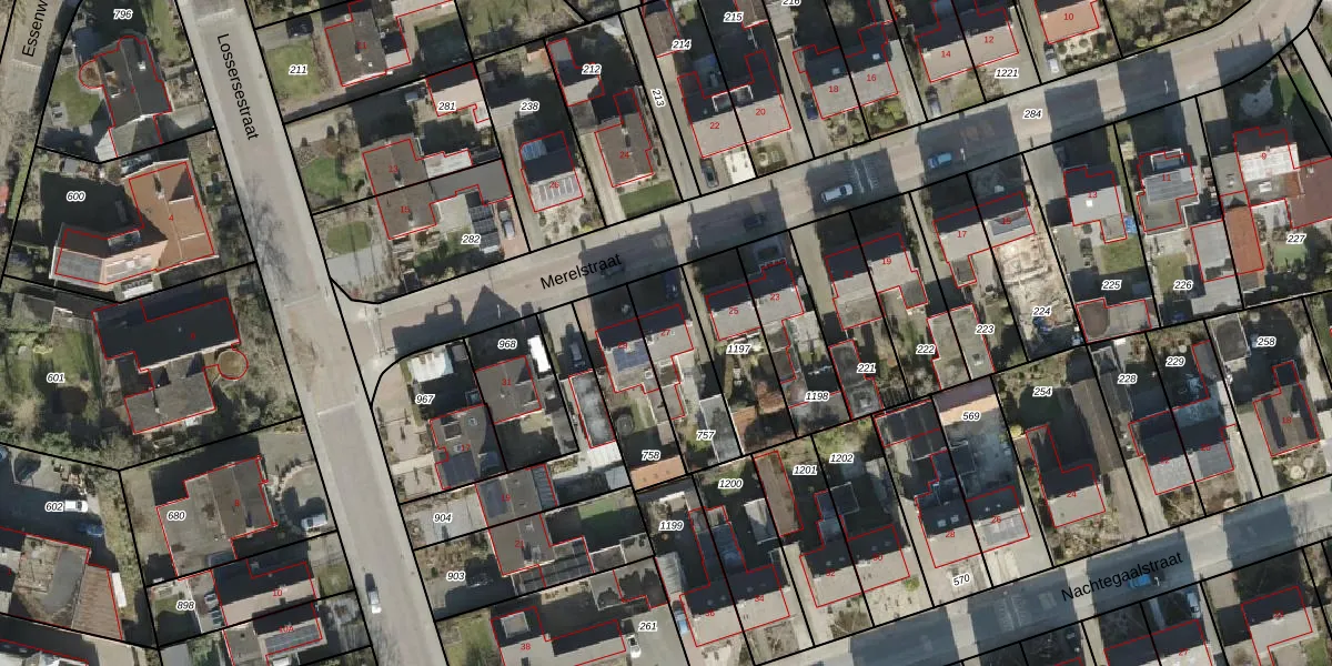Merelstraat 27 is gelegen op kadastraal perceel LSR00O757. Deze kadastrale aanduiding is uniek en wordt gebruikt door het Kadaster om eigendomsrechten en andere zakelijke rechten vast te leggen. Het perceel maakt onderdeel uit van de kadastrale gemeente Losser.