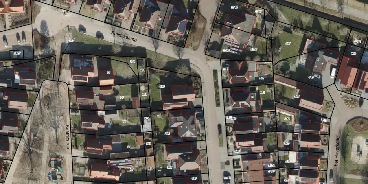 Het perceel waarop Smidskaamp 17 staat heeft een oppervlakte van 575 m². Dit is een groot perceel. De perceeloppervlakte wordt geregistreerd door het Kadaster. Gedetailleerde informatie over de maten van dit perceel kunt u vinden in het rapport Kadastrale kaart met maatvoering van Smidskaamp 17.