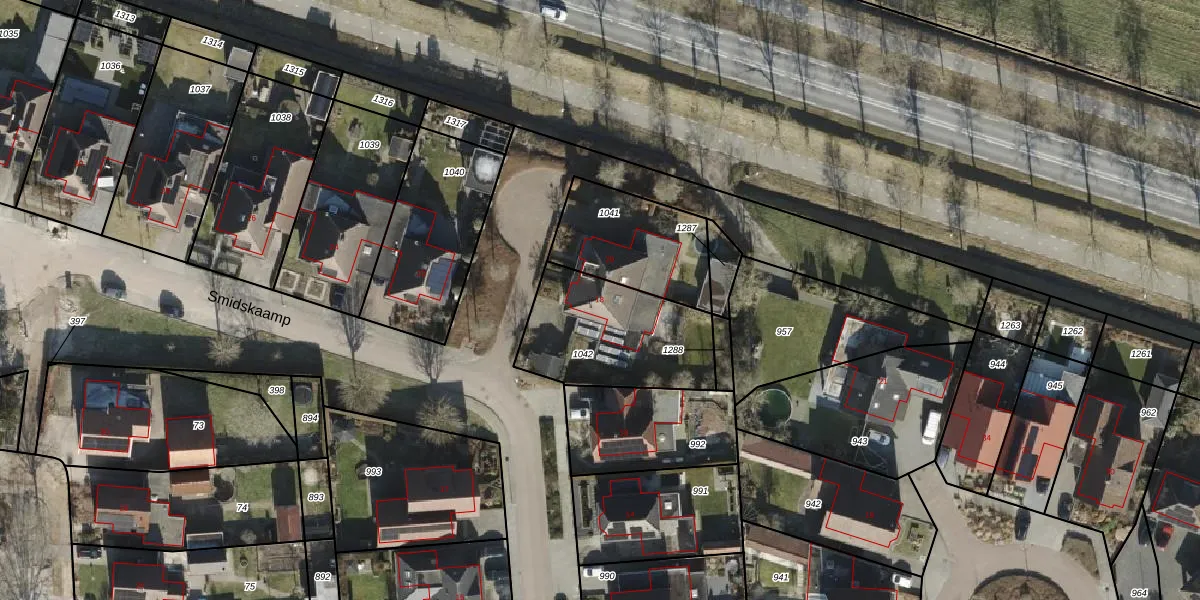 Het perceel waarop Smidskaamp 18 staat heeft een oppervlakte van 515 m². Dit is een groot perceel. De perceeloppervlakte wordt geregistreerd door het Kadaster. Gedetailleerde informatie over de maten van dit perceel kunt u vinden in het rapport Kadastrale kaart met maatvoering van Smidskaamp 18.
