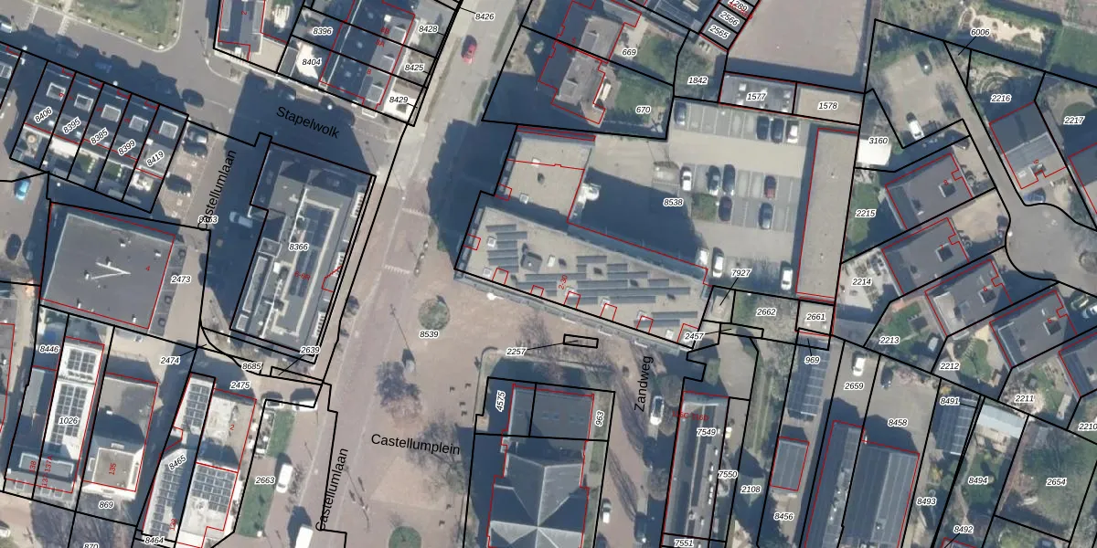 Het perceel waarop Castellumplein 28 staat heeft een oppervlakte van 2260 m². Dit is een zeer groot perceel. De perceeloppervlakte wordt geregistreerd door het Kadaster. Gedetailleerde informatie over de maten van dit perceel kunt u vinden in het rapport Kadastrale kaart met maatvoering van Castellumplein 28.