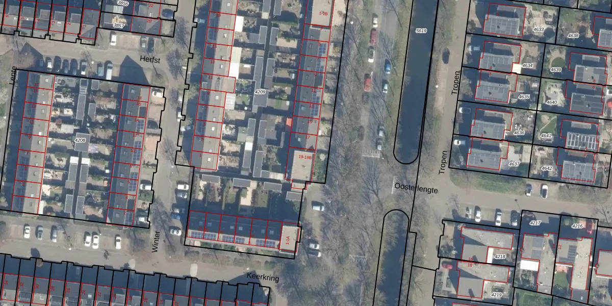 Het perceel waarop Evenaar 19 staat heeft een oppervlakte van 4055 m². Dit is een zeer groot perceel. De perceeloppervlakte wordt geregistreerd door het Kadaster. Gedetailleerde informatie over de maten van dit perceel kunt u vinden in het rapport Kadastrale kaart met maatvoering van Evenaar 19.