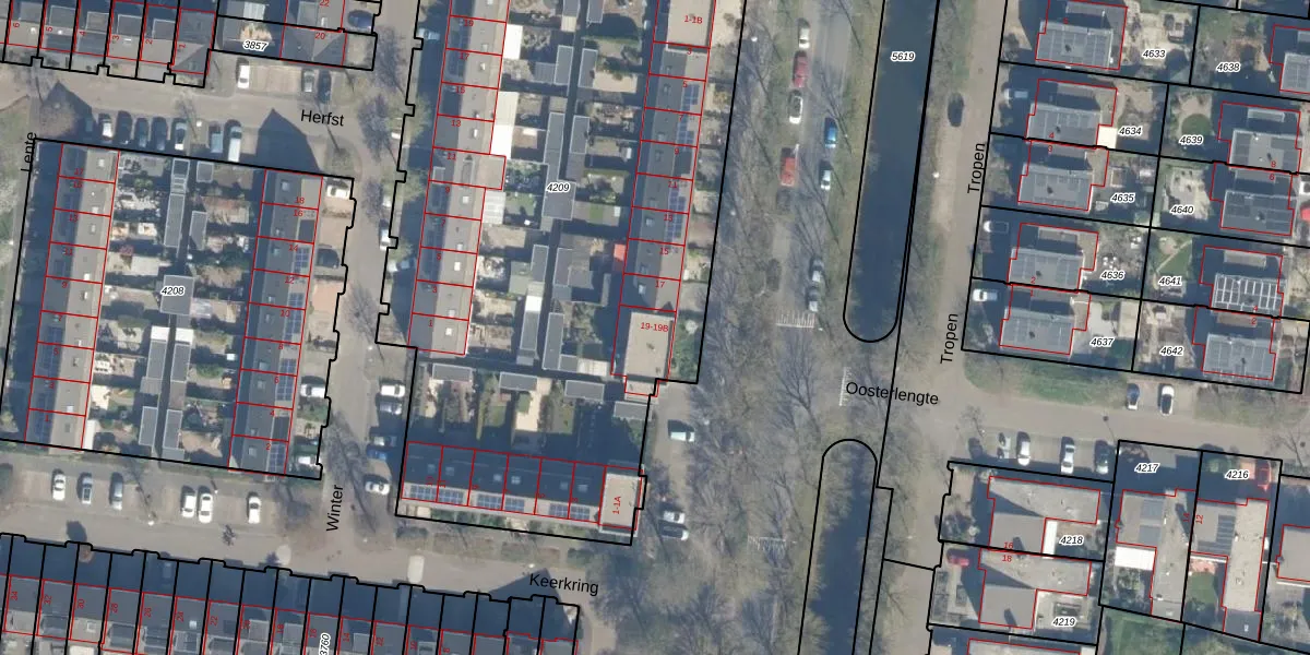Het perceel waarop Evenaar 19-A staat heeft een oppervlakte van 4055 m². Dit is een zeer groot perceel. De perceeloppervlakte wordt geregistreerd door het Kadaster. Gedetailleerde informatie over de maten van dit perceel kunt u vinden in het rapport Kadastrale kaart met maatvoering van Evenaar 19-A.