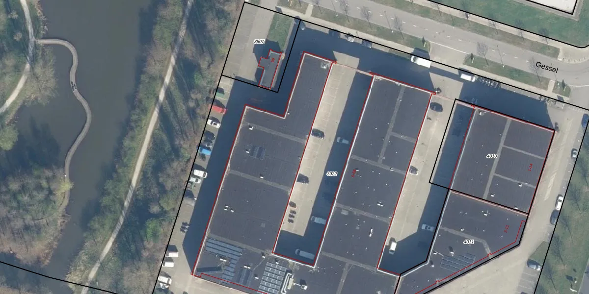 Het perceel waarop Gessel 45 staat heeft een oppervlakte van 1,0 ha. Dit is een zeer groot perceel. De perceeloppervlakte wordt geregistreerd door het Kadaster. Gedetailleerde informatie over de maten van dit perceel kunt u vinden in het rapport Kadastrale kaart met maatvoering van Gessel 45.