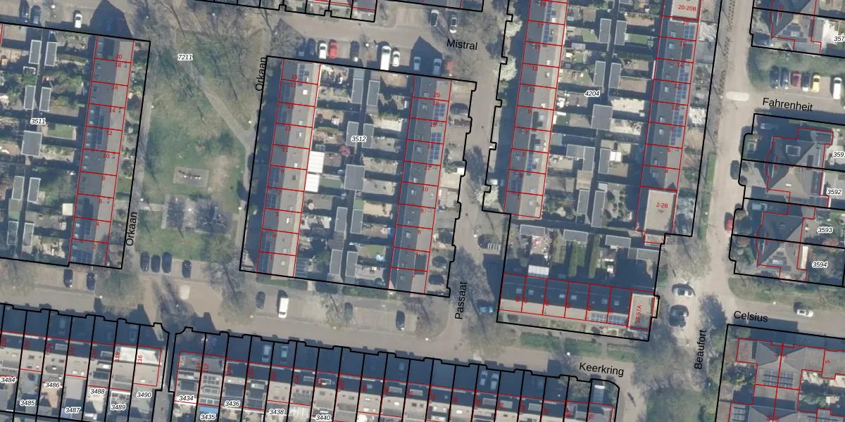 Het perceel waarop Passaat 8 staat heeft een oppervlakte van 2540 m². Dit is een zeer groot perceel. De perceeloppervlakte wordt geregistreerd door het Kadaster. Gedetailleerde informatie over de maten van dit perceel kunt u vinden in het rapport Kadastrale kaart met maatvoering van Passaat 8.