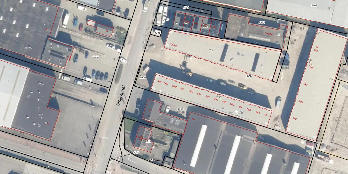 Het perceel waarop Strijkviertel 56-M staat heeft een oppervlakte van 5219 m². Dit is een zeer groot perceel. De perceeloppervlakte wordt geregistreerd door het Kadaster. Gedetailleerde informatie over de maten van dit perceel kunt u vinden in het rapport Kadastrale kaart met maatvoering van Strijkviertel 56-M.