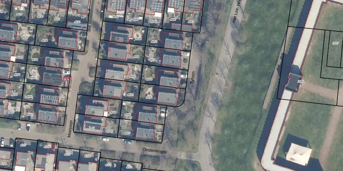 Het perceel waarop Tyfoon 4 staat heeft een oppervlakte van 294 m². Dit is een middelgroot perceel. De perceeloppervlakte wordt geregistreerd door het Kadaster. Gedetailleerde informatie over de maten van dit perceel kunt u vinden in het rapport Kadastrale kaart met maatvoering van Tyfoon 4.