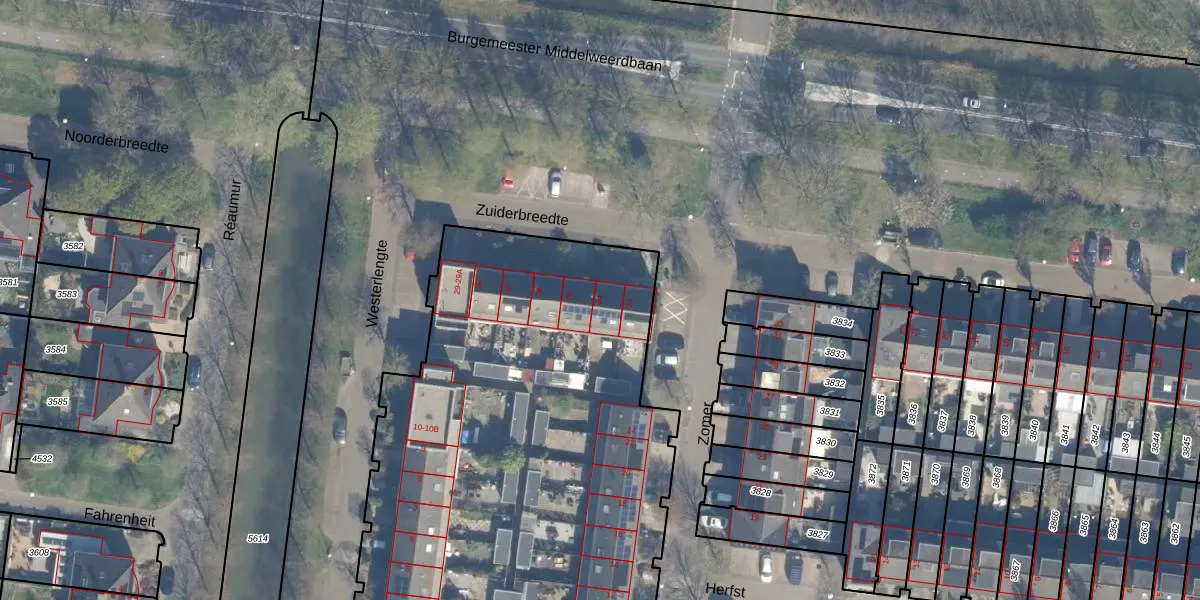 Het perceel waarop Zuiderbreedte 24 staat heeft een oppervlakte van 4935 m². Dit is een zeer groot perceel. De perceeloppervlakte wordt geregistreerd door het Kadaster. Gedetailleerde informatie over de maten van dit perceel kunt u vinden in het rapport Kadastrale kaart met maatvoering van Zuiderbreedte 24.