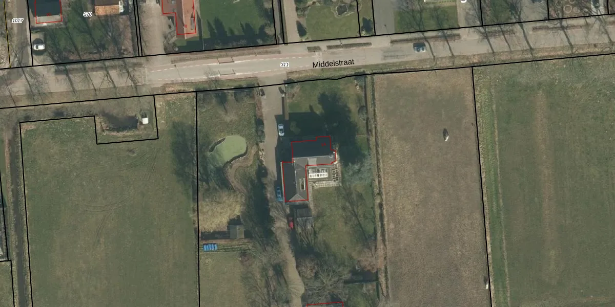 Het perceel waarop Middelstraat 1-A staat heeft een oppervlakte van 1,5 ha. Dit is een zeer groot perceel. De perceeloppervlakte wordt geregistreerd door het Kadaster. Gedetailleerde informatie over de maten van dit perceel kunt u vinden in het rapport Kadastrale kaart met maatvoering van Middelstraat 1-A.