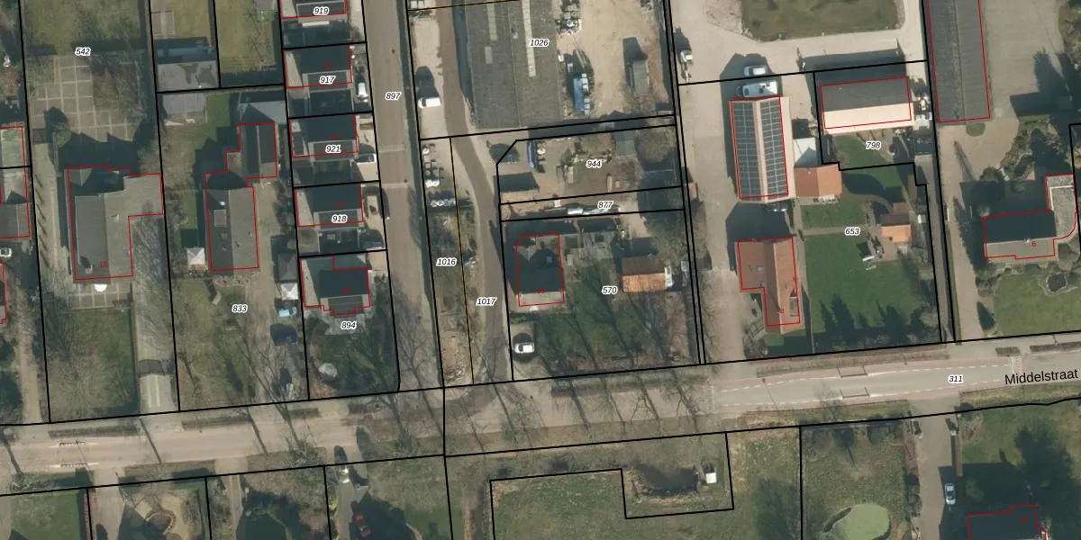 Middelstraat 10 is gelegen op kadastraal perceel LOO00Q570. Deze kadastrale aanduiding is uniek en wordt gebruikt door het Kadaster om eigendomsrechten en andere zakelijke rechten vast te leggen. Het perceel maakt onderdeel uit van de kadastrale gemeente Loon op Zand.