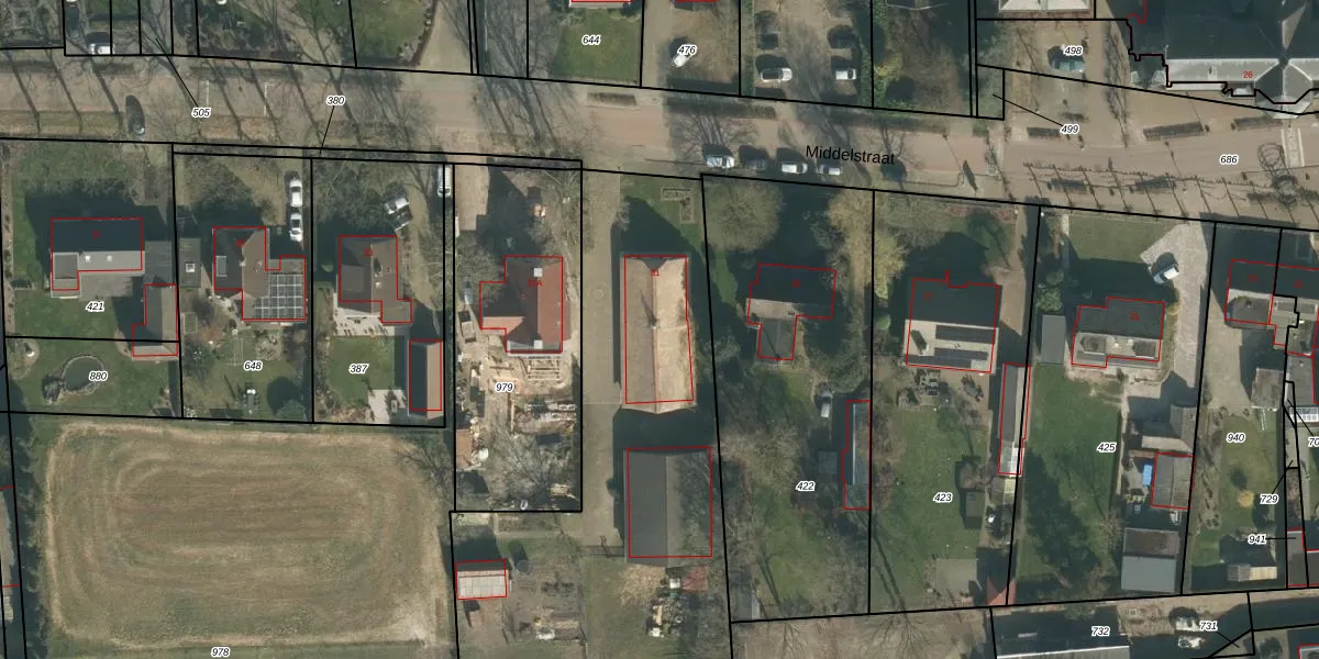 Het perceel waarop Middelstraat 31 staat heeft een oppervlakte van 1,5 ha. Dit is een zeer groot perceel. De perceeloppervlakte wordt geregistreerd door het Kadaster. Gedetailleerde informatie over de maten van dit perceel kunt u vinden in het rapport Kadastrale kaart met maatvoering van Middelstraat 31.
