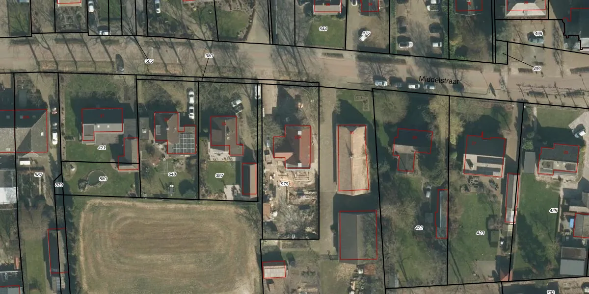 Het perceel waarop Middelstraat 31-A staat heeft een oppervlakte van 1011 m². Dit is een zeer groot perceel. De perceeloppervlakte wordt geregistreerd door het Kadaster. Gedetailleerde informatie over de maten van dit perceel kunt u vinden in het rapport Kadastrale kaart met maatvoering van Middelstraat 31-A.