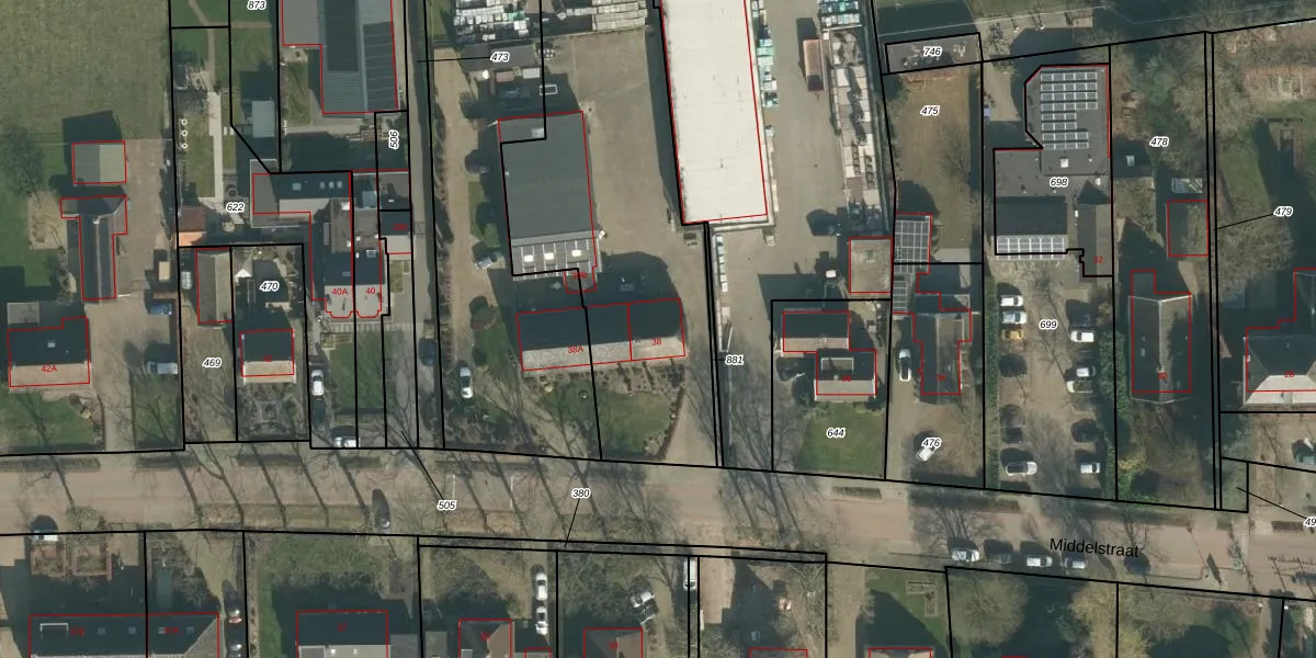 Het perceel waarop Middelstraat 38 staat heeft een oppervlakte van 2165 m². Dit is een zeer groot perceel. De perceeloppervlakte wordt geregistreerd door het Kadaster. Gedetailleerde informatie over de maten van dit perceel kunt u vinden in het rapport Kadastrale kaart met maatvoering van Middelstraat 38.