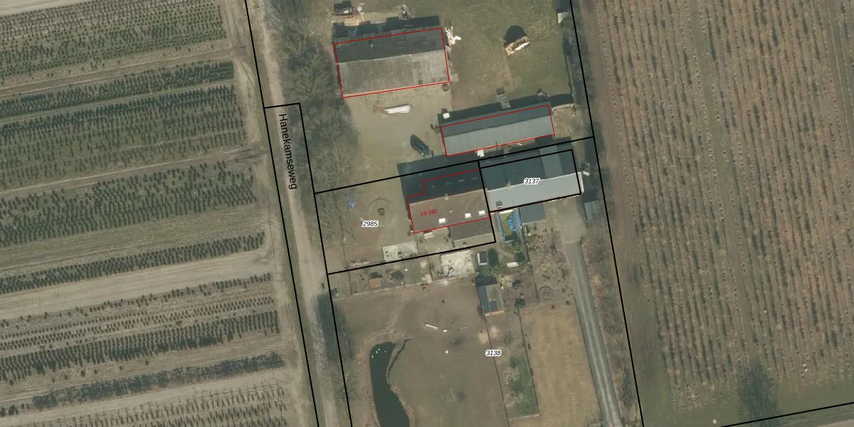 Hanekamseweg 19 is gelegen op kadastraal perceel GMT00O2985. Deze kadastrale aanduiding is uniek en wordt gebruikt door het Kadaster om eigendomsrechten en andere zakelijke rechten vast te leggen. Het perceel maakt onderdeel uit van de kadastrale gemeente Gemert.