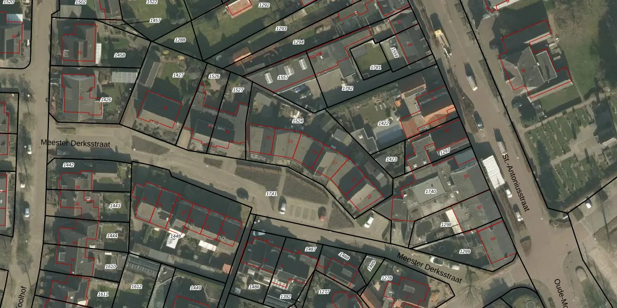 Meester Derksstraat 19 is gelegen op kadastraal perceel GMT00F1524. Deze kadastrale aanduiding is uniek en wordt gebruikt door het Kadaster om eigendomsrechten en andere zakelijke rechten vast te leggen. Het perceel maakt onderdeel uit van de kadastrale gemeente Gemert.