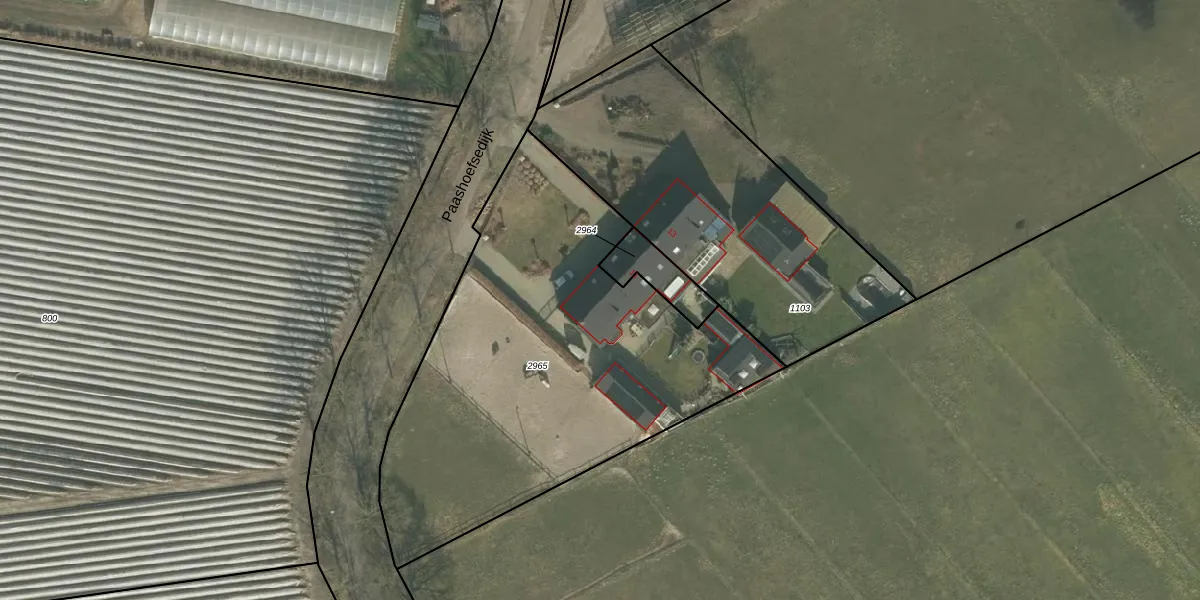 Paashoefsedijk 11 is gelegen op kadastraal perceel GMT00O2965. Deze kadastrale aanduiding is uniek en wordt gebruikt door het Kadaster om eigendomsrechten en andere zakelijke rechten vast te leggen. Het perceel maakt onderdeel uit van de kadastrale gemeente Gemert.