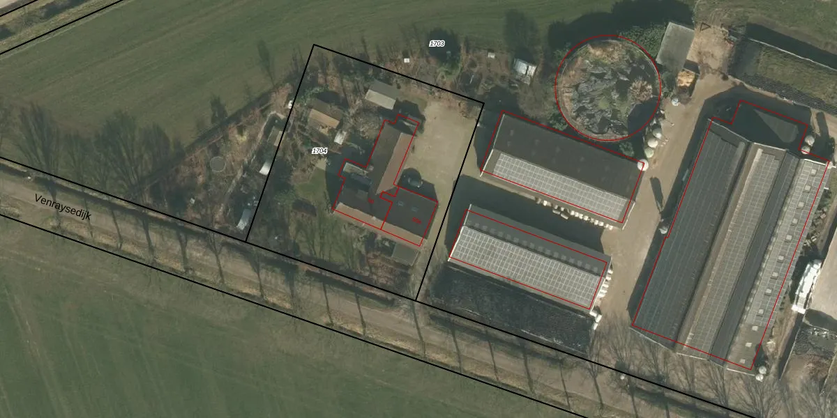 Het perceel waarop Venraysedijk 50-a staat heeft een oppervlakte van 2150 m². Dit is een zeer groot perceel. De perceeloppervlakte wordt geregistreerd door het Kadaster. Gedetailleerde informatie over de maten van dit perceel kunt u vinden in het rapport Kadastrale kaart met maatvoering van Venraysedijk 50-a.
