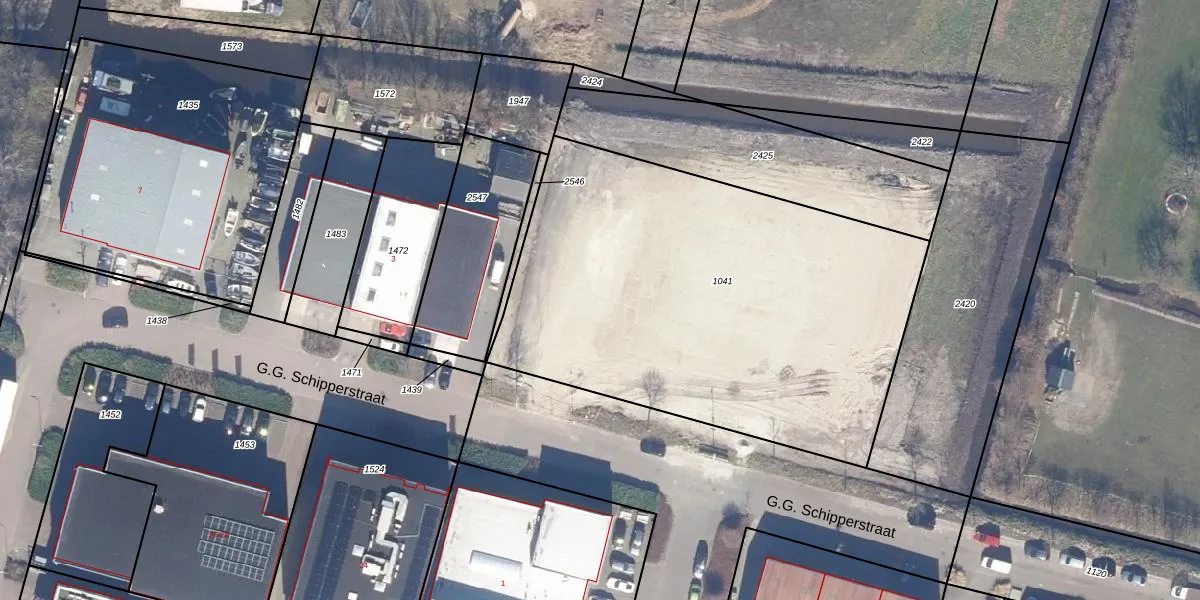 Het perceel waarop G.G. Schipperstraat 1-E staat heeft een oppervlakte van 2577 m². Dit is een zeer groot perceel. De perceeloppervlakte wordt geregistreerd door het Kadaster. Gedetailleerde informatie over de maten van dit perceel kunt u vinden in het rapport Kadastrale kaart met maatvoering van G.G. Schipperstraat 1-E.
