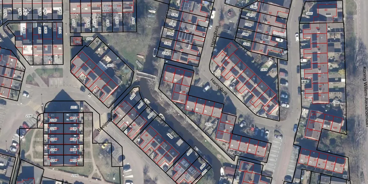 Het perceel waarop Haringbuis 66 staat heeft een oppervlakte van 1030 m². Dit is een zeer groot perceel. De perceeloppervlakte wordt geregistreerd door het Kadaster. Gedetailleerde informatie over de maten van dit perceel kunt u vinden in het rapport Kadastrale kaart met maatvoering van Haringbuis 66.