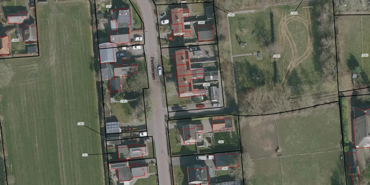 Het perceel waarop Peinderwei 11 staat heeft een oppervlakte van 1045 m². Dit is een zeer groot perceel. De perceeloppervlakte wordt geregistreerd door het Kadaster. Gedetailleerde informatie over de maten van dit perceel kunt u vinden in het rapport Kadastrale kaart met maatvoering van Peinderwei 11.