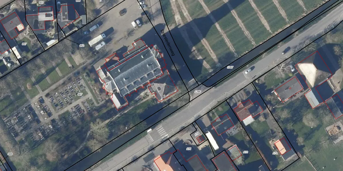 Het perceel waarop Driestedenweg 1 staat heeft een oppervlakte van 7478 m². Dit is een zeer groot perceel. De perceeloppervlakte wordt geregistreerd door het Kadaster. Gedetailleerde informatie over de maten van dit perceel kunt u vinden in het rapport Kadastrale kaart met maatvoering van Driestedenweg 1.