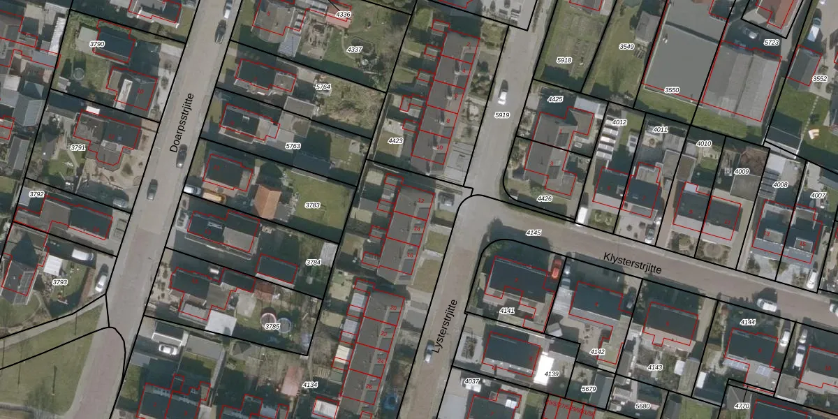 Het perceel waarop Lysterstrjitte 12 staat heeft een oppervlakte van 3105 m². Dit is een zeer groot perceel. De perceeloppervlakte wordt geregistreerd door het Kadaster. Gedetailleerde informatie over de maten van dit perceel kunt u vinden in het rapport Kadastrale kaart met maatvoering van Lysterstrjitte 12.