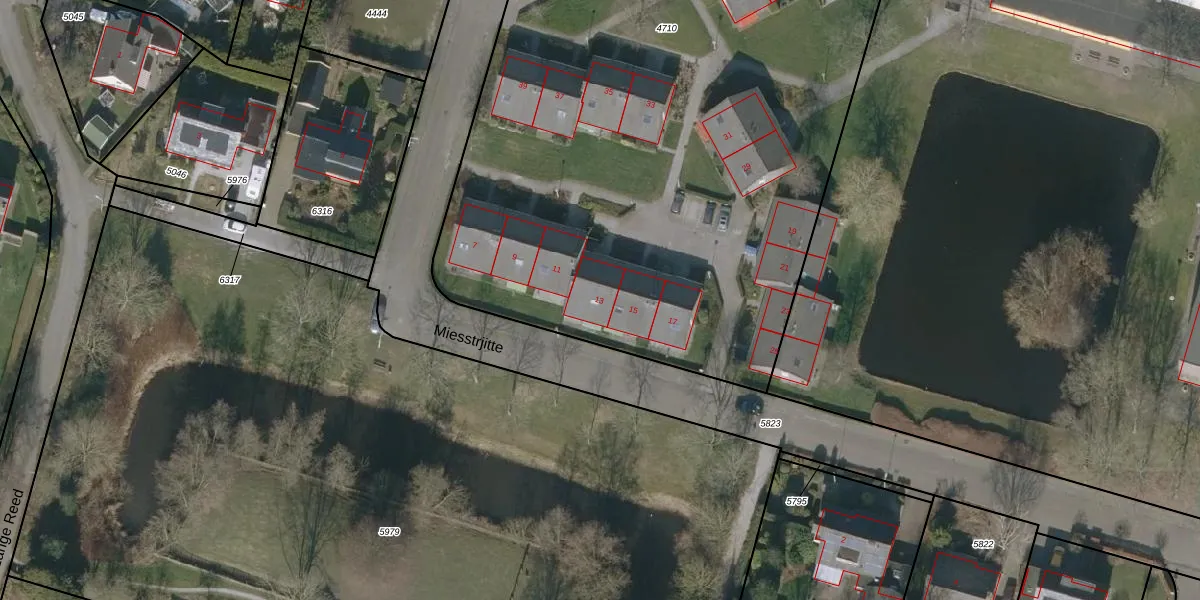 Het perceel waarop Miesstrjitte 13 staat heeft een oppervlakte van 6475 m². Dit is een zeer groot perceel. De perceeloppervlakte wordt geregistreerd door het Kadaster. Gedetailleerde informatie over de maten van dit perceel kunt u vinden in het rapport Kadastrale kaart met maatvoering van Miesstrjitte 13.