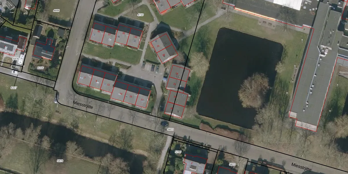 Het perceel waarop Miesstrjitte 21 staat heeft een oppervlakte van 6475 m². Dit is een zeer groot perceel. De perceeloppervlakte wordt geregistreerd door het Kadaster. Gedetailleerde informatie over de maten van dit perceel kunt u vinden in het rapport Kadastrale kaart met maatvoering van Miesstrjitte 21.