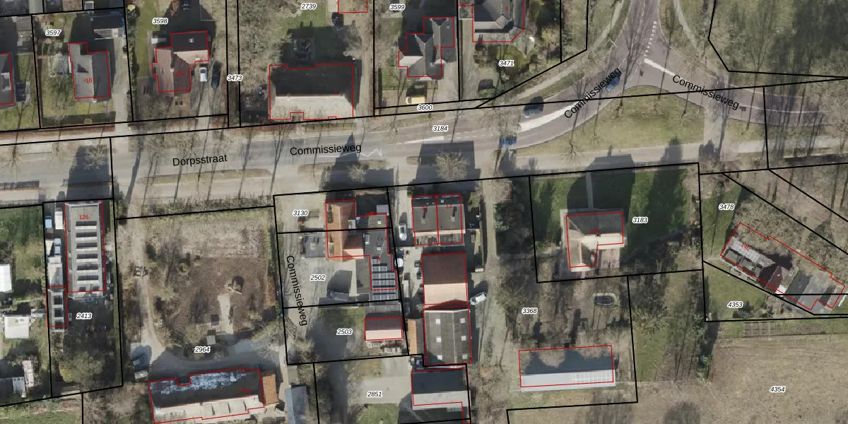 Het perceel waarop Commissieweg 12 staat heeft een oppervlakte van 2607 m². Dit is een zeer groot perceel. De perceeloppervlakte wordt geregistreerd door het Kadaster. Gedetailleerde informatie over de maten van dit perceel kunt u vinden in het rapport Kadastrale kaart met maatvoering van Commissieweg 12.