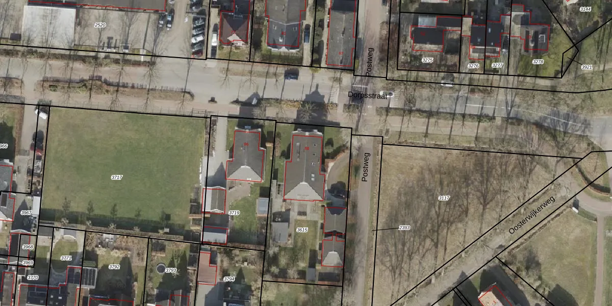 Het perceel waarop Dorpsstraat 88 staat heeft een oppervlakte van 1334 m². Dit is een zeer groot perceel. De perceeloppervlakte wordt geregistreerd door het Kadaster. Gedetailleerde informatie over de maten van dit perceel kunt u vinden in het rapport Kadastrale kaart met maatvoering van Dorpsstraat 88.