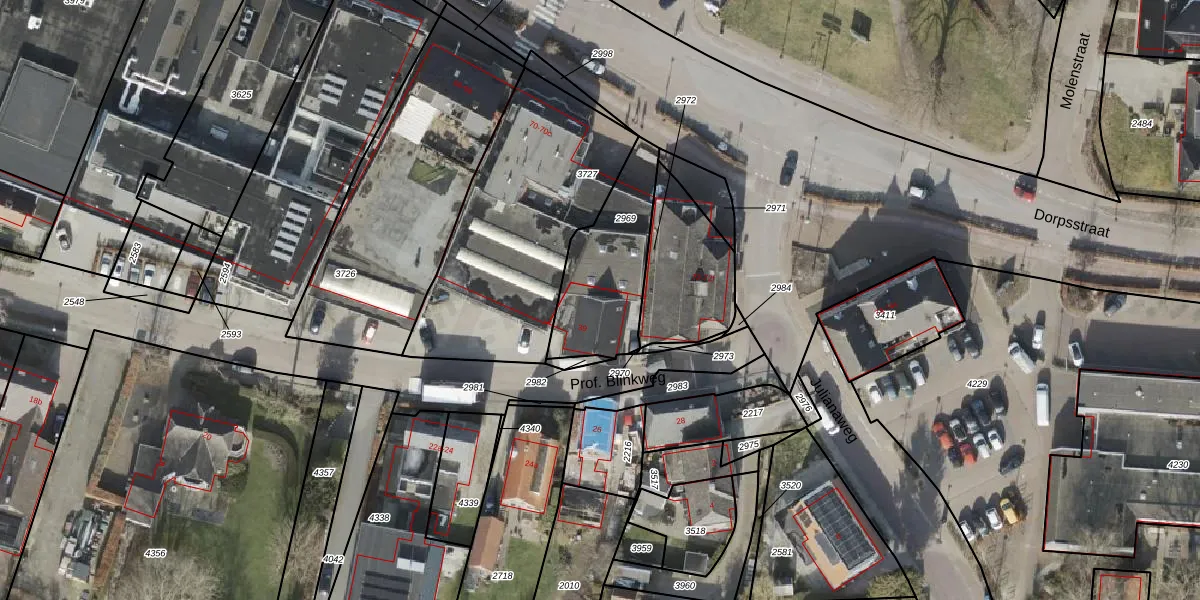 Gebruik de zoekbalk of klik op een perceel voor informatie over de adressen binnen dit perceel.
