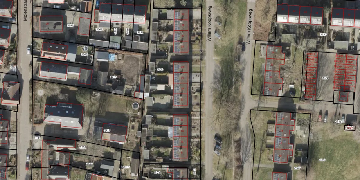 Het perceel waarop Willem Koopsweg 19 staat heeft een oppervlakte van 3456 m². Dit is een zeer groot perceel. De perceeloppervlakte wordt geregistreerd door het Kadaster. Gedetailleerde informatie over de maten van dit perceel kunt u vinden in het rapport Kadastrale kaart met maatvoering van Willem Koopsweg 19.