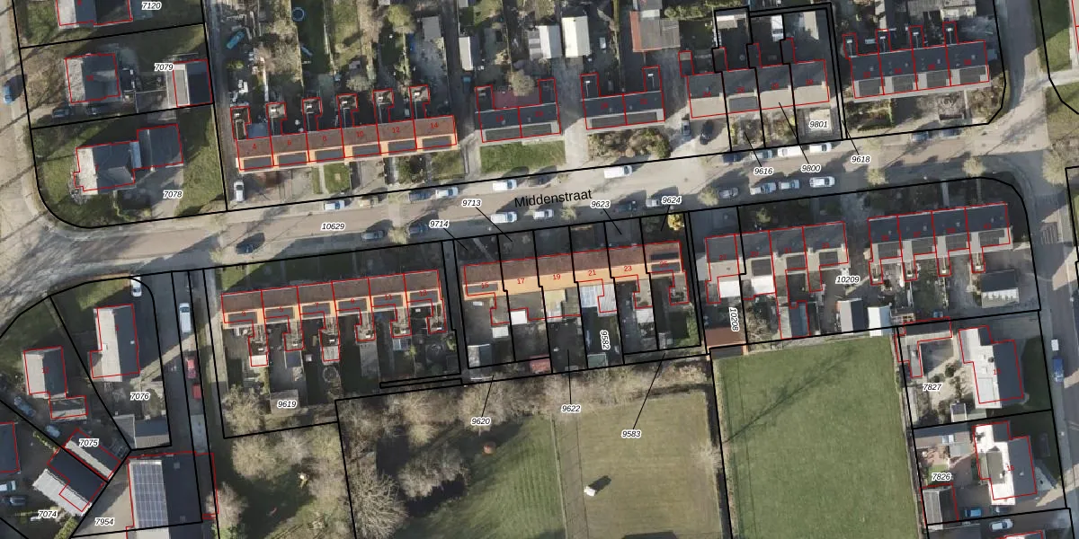 Het perceel waarop Middenstraat 19 staat heeft een oppervlakte van 180 m². Dit is een middelgroot perceel. De perceeloppervlakte wordt geregistreerd door het Kadaster. Gedetailleerde informatie over de maten van dit perceel kunt u vinden in het rapport Kadastrale kaart met maatvoering van Middenstraat 19.