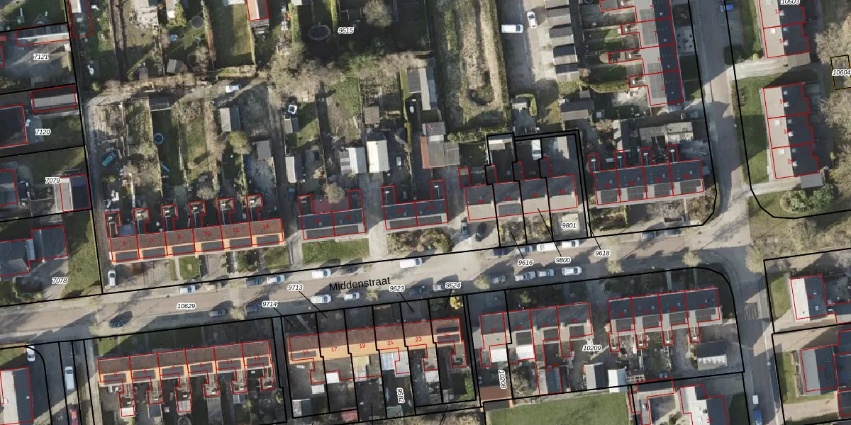 Het perceel waarop Middenstraat 22 staat heeft een oppervlakte van 1,3 ha. Dit is een zeer groot perceel. De perceeloppervlakte wordt geregistreerd door het Kadaster. Gedetailleerde informatie over de maten van dit perceel kunt u vinden in het rapport Kadastrale kaart met maatvoering van Middenstraat 22.