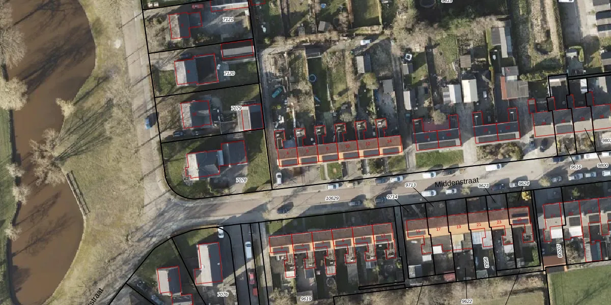 Het perceel waarop Middenstraat 6 staat heeft een oppervlakte van 1,3 ha. Dit is een zeer groot perceel. De perceeloppervlakte wordt geregistreerd door het Kadaster. Gedetailleerde informatie over de maten van dit perceel kunt u vinden in het rapport Kadastrale kaart met maatvoering van Middenstraat 6.