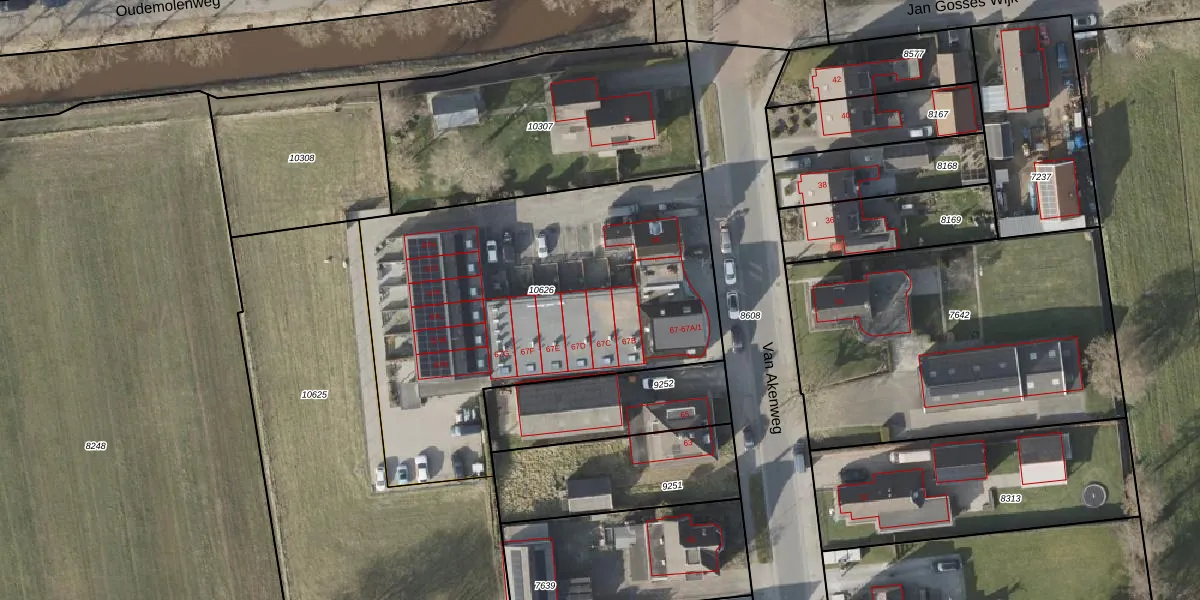 Het perceel waarop Van Akenweg 67-C staat heeft een oppervlakte van 2047 m². Dit is een zeer groot perceel. De perceeloppervlakte wordt geregistreerd door het Kadaster. Gedetailleerde informatie over de maten van dit perceel kunt u vinden in het rapport Kadastrale kaart met maatvoering van Van Akenweg 67-C.