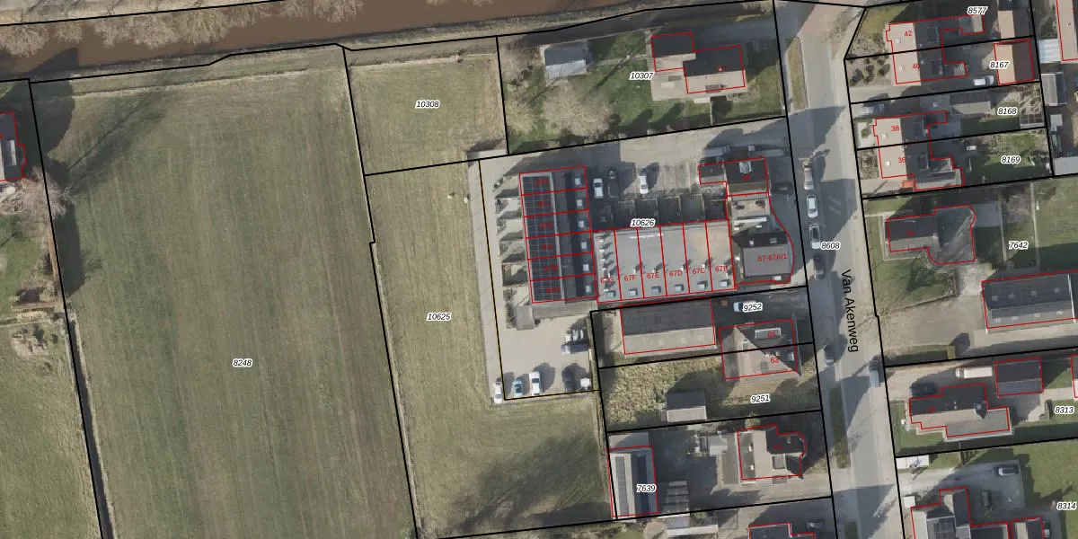 Het perceel waarop Van Akenweg 67-M staat heeft een oppervlakte van 2047 m². Dit is een zeer groot perceel. De perceeloppervlakte wordt geregistreerd door het Kadaster. Gedetailleerde informatie over de maten van dit perceel kunt u vinden in het rapport Kadastrale kaart met maatvoering van Van Akenweg 67-M.
