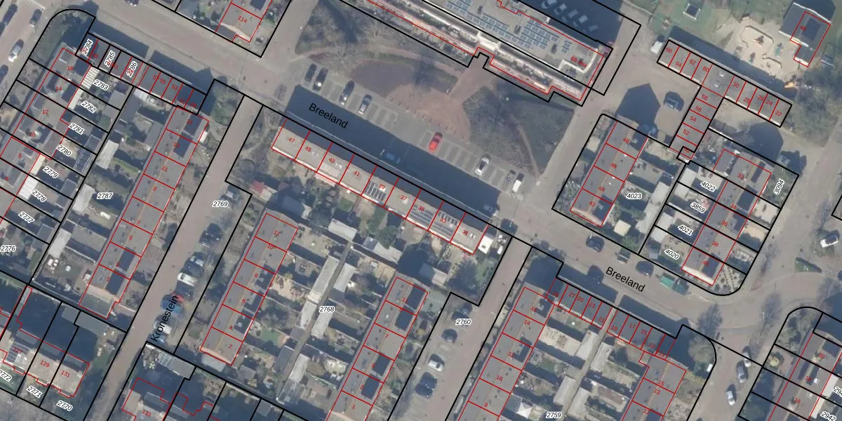 Het perceel waarop Breeland 35 staat heeft een oppervlakte van 3533 m². Dit is een zeer groot perceel. De perceeloppervlakte wordt geregistreerd door het Kadaster. Gedetailleerde informatie over de maten van dit perceel kunt u vinden in het rapport Kadastrale kaart met maatvoering van Breeland 35.