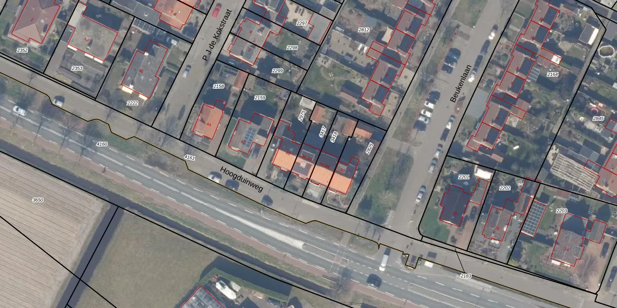 Het perceel waarop Hoogduinweg 38 staat heeft een oppervlakte van 202 m². Dit is een middelgroot perceel. De perceeloppervlakte wordt geregistreerd door het Kadaster. Gedetailleerde informatie over de maten van dit perceel kunt u vinden in het rapport Kadastrale kaart met maatvoering van Hoogduinweg 38.